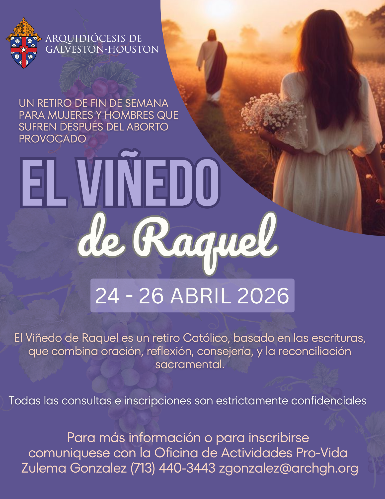 Un retiro Católico para mujeres y hombres que sufren después del aborto provocado. Todas las consultas e inscripciones son estrictamente confidencial. Para más información o para inscribirse llame a Zulema 713-440-3443 o envíe un mensaje a [email protected]. Información adicional está el volante del evento.