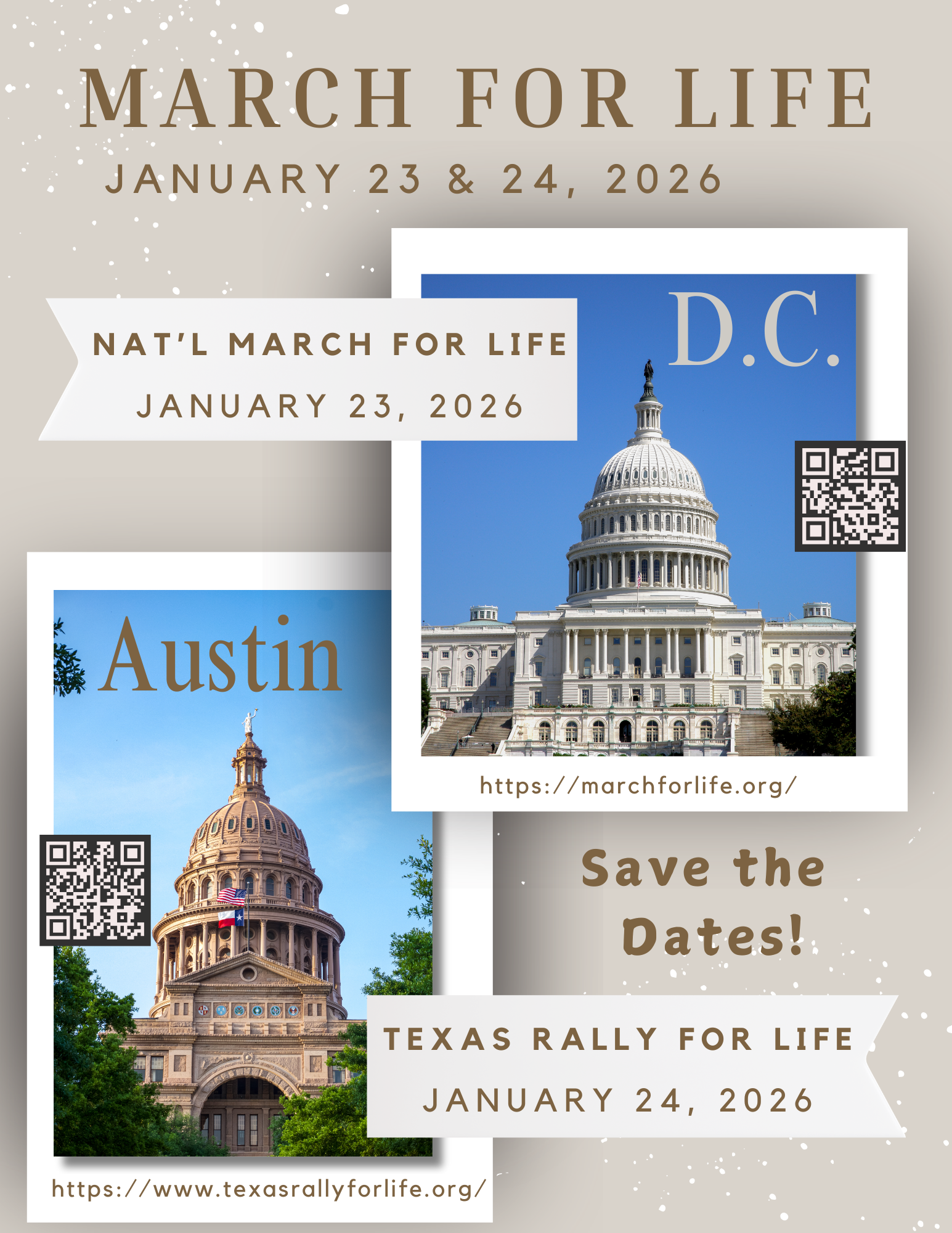 Únase a otros tejanos en la marcha anual Texas Rally for Life en Austin para defender el derecho a la vida. Las parroquias de la archidiócesis fletaran autobuses para viajar a Austin y participar en este evento anual. Para mas ver la lista de parroquias participantes, haga clic aquí.