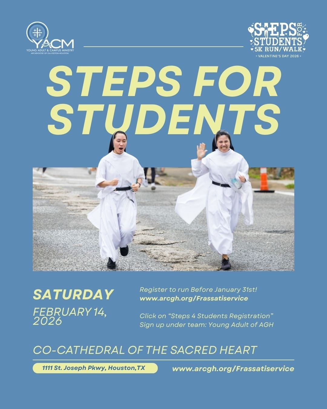 Steps for Students es una carrera de 5K que apoya a las escuelas católicas de la Arquidiócesis de Galveston-Houston. La próxima carrera se llevará a cabo en la Co-Catedral del Sagrado Corazón el SÁBADO 14 de febrero de 2026. Se anima a los jóvenes adultos a registrarse para correr, ser voluntarios o hacer una donación. Para obtener información sobre registro y voluntariado, visita el siguiente enlace:
