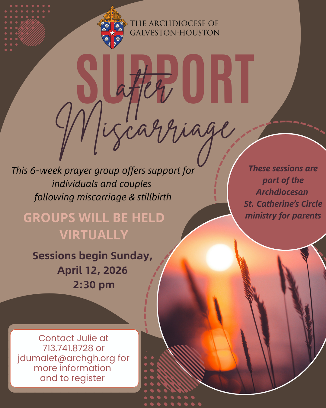 The archdiocese through the Office of Pro-Life Activities will begin offering its new miscarriage support group beginning on Sunday, April 12, 2026 at 2:30 pm. This six-week support group is available for individuals and couples following miscarriage, stillbirth or infant loss. Interested individuals can contact the Pro-Life Office for more information or to register for the group at 713-440-3443 or [email protected]. See the attached flyer and graphic.