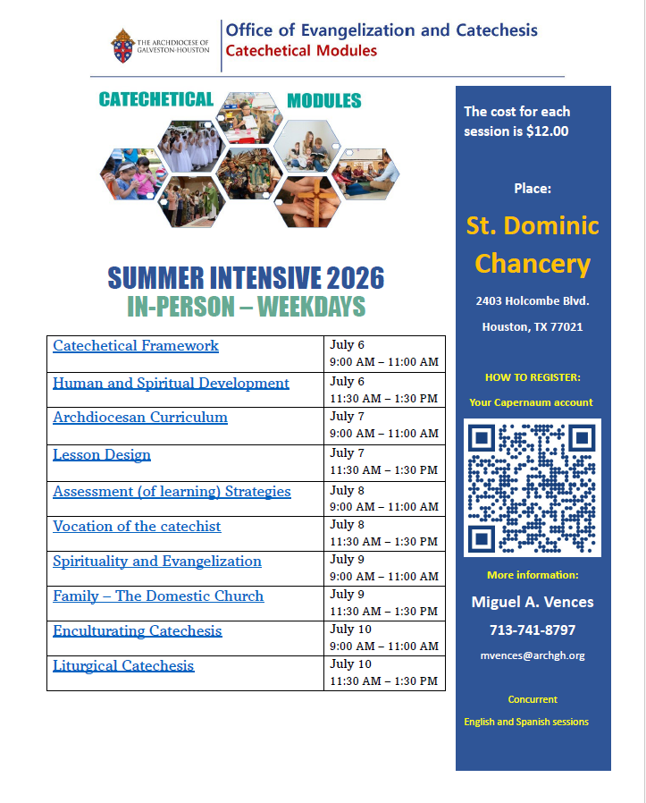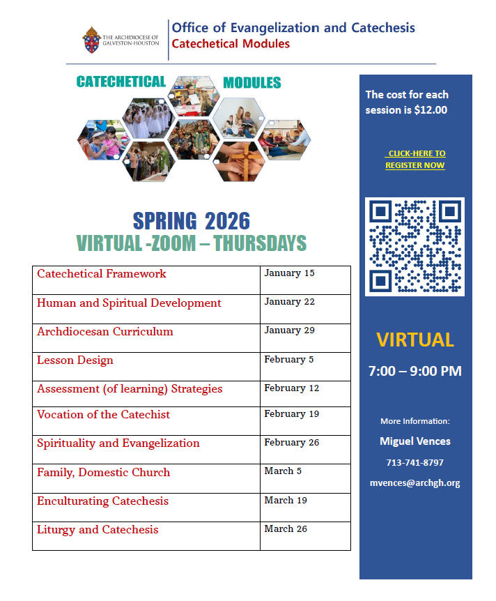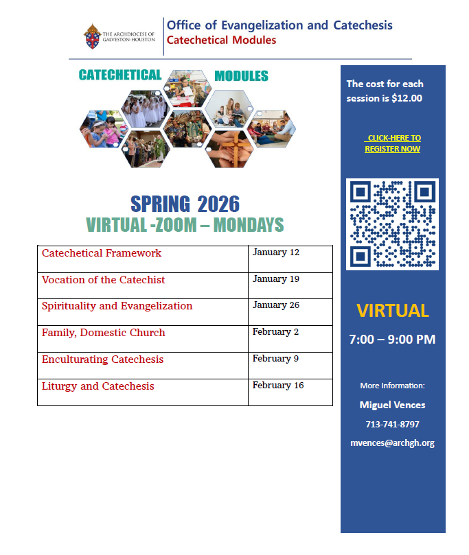 Este módulos sirve como una orientación el ministerio catequético en la Arquidiócesis de Galveston-Houston y se enfoca en explorar cual es la misión que todo catequista debe cumplir, según los documentos de la iglesia.