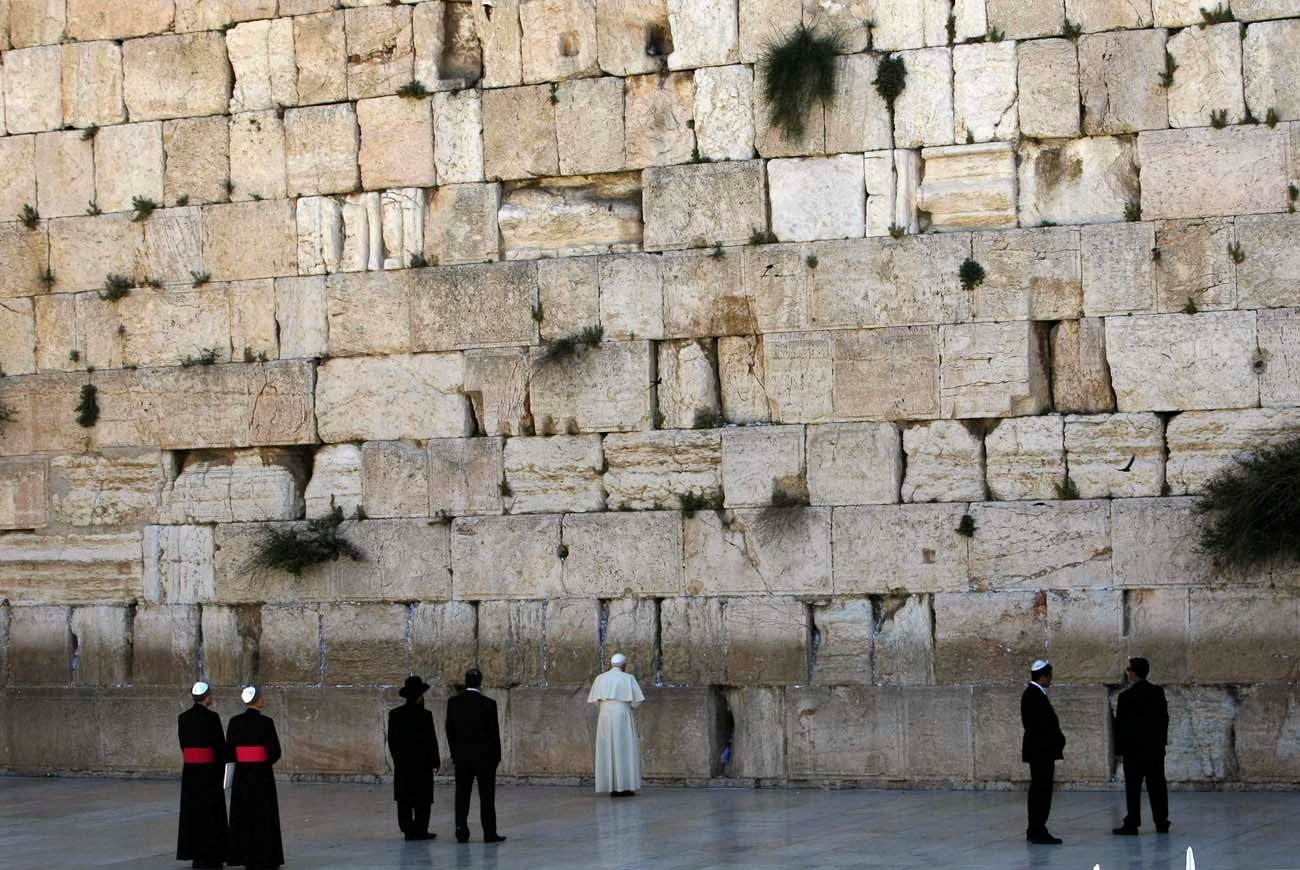 Pope Benedict XVI visits the Western Wall, Judaism’s holiest prayer site, in the Old City of Jerusalem May 12, 2009. Rabbi Shmuel Rabinovitch, the rabbi of the Western Wall, is pictured third from left. The pope left a written prayer for peace in a crevice of the wall. (CNS photo)