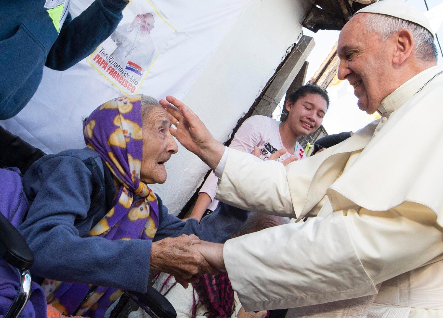 Pope Francis greets an elderly woman as he meets with people in Asuncion, Paraguay, in this July 12, 2015, file photo. (CNS photo/Paul Haring)