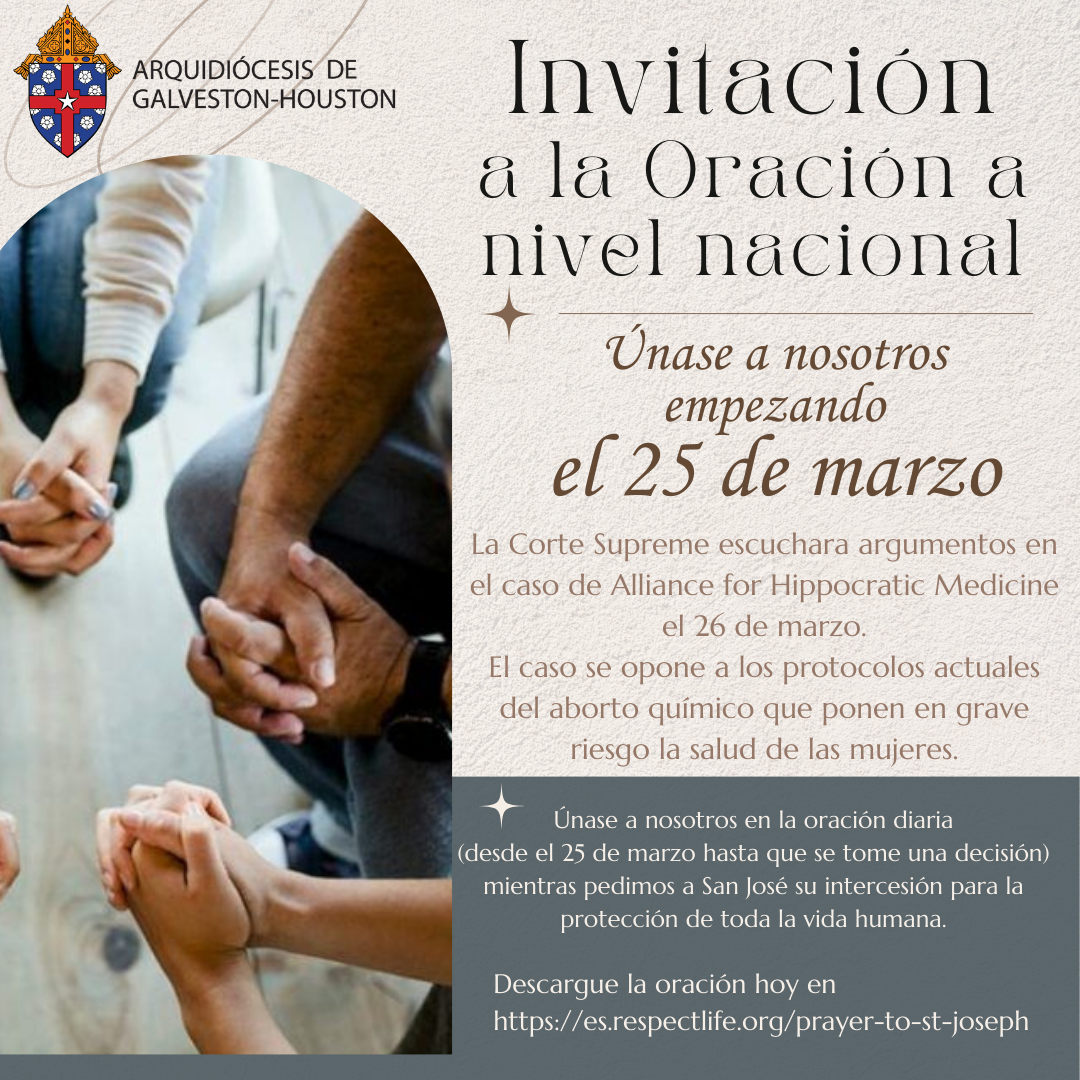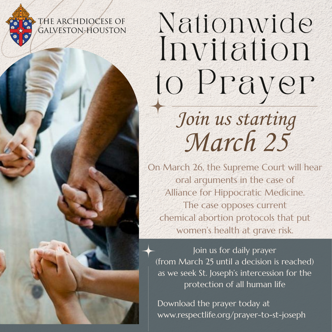 The USCCB Committee on Pro-Life Activities is inviting Catholics to join a focused effort of prayer for the end of abortion and the protection of women and preborn children, beginning on March 25, the eve of the oral arguments, and the anniversary of St. John Paul II’s landmark, pro-life encyclical, The Gospel of Life (Evangelium vitae). In particular, we will invoke the intercession of St. Joseph, Defender of Life with this prayer (en español):