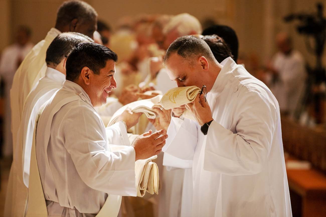 Deacon Carlos Hernandez Saavedra, at right, kisses his stole that was handed to him by Deacon Rey Croson during a Mass of Ordination to the Permanent Diaconate on Feb. 18 at the Co-Cathedral of the Sacred Heart. Daniel Cardinal DiNardo ordained 45 men, all from different walks of life, to the diaconate. They will serve at parishes and ministries across the Archdiocese. (Photos by James Ramos/Herald)HOUSTON — At two separate Masses, Daniel Cardinal DiNardo ordained 45 new permanent deacons — 23 on Feb. 17 and another 22 on Feb. 18 — at the Co-Cathedral of the Sacred Heart after they “were found worthy” by their pastors and parishes.