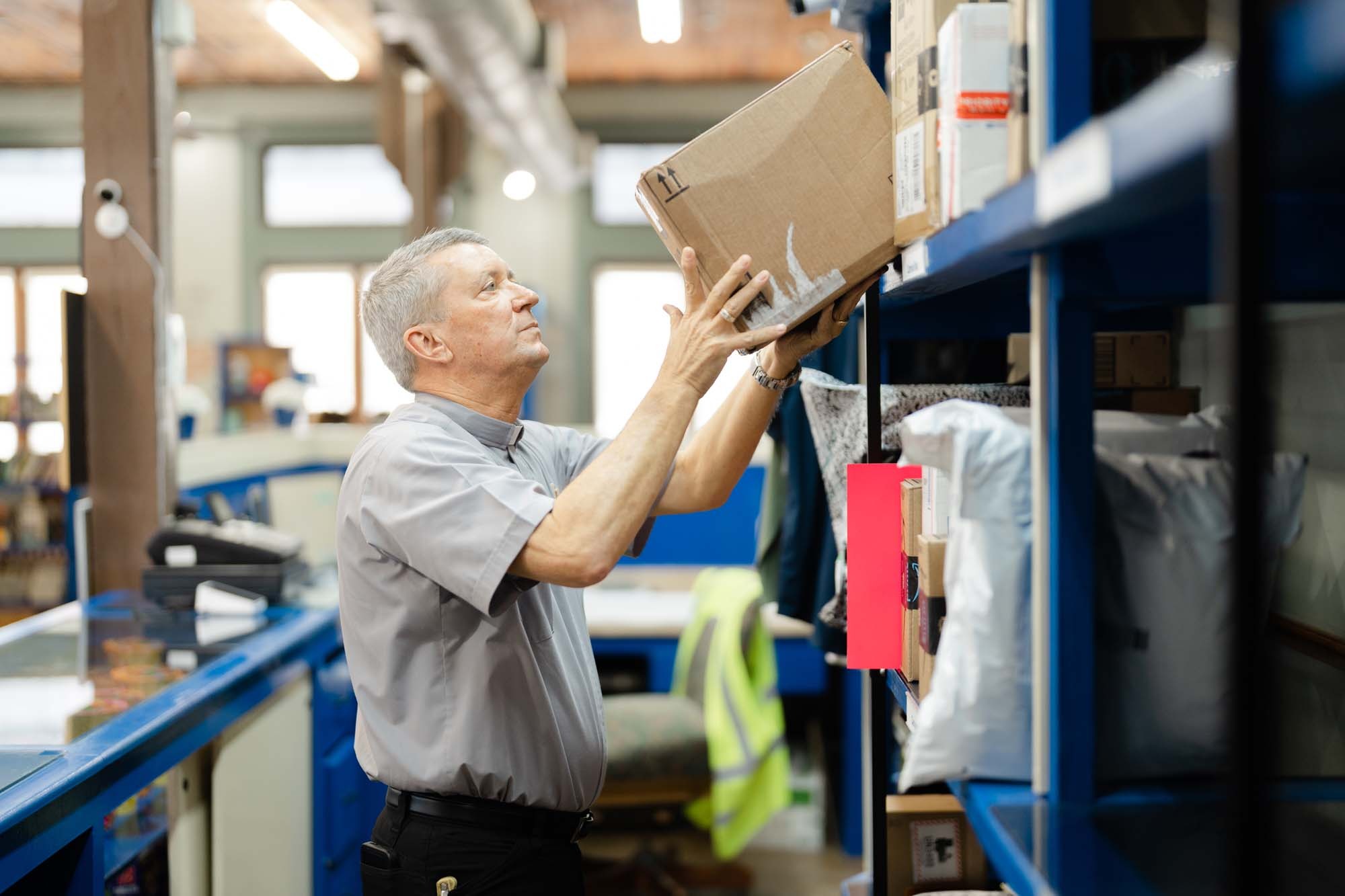 Deacon Jeff Willard, who leads the Galveston Seafarers Center, sorts through packages delivered to the center, one of the several services offered by the Port Chaplaincy Ministry in Galveston Island. (File photo by Office Of Development And Stewardship)