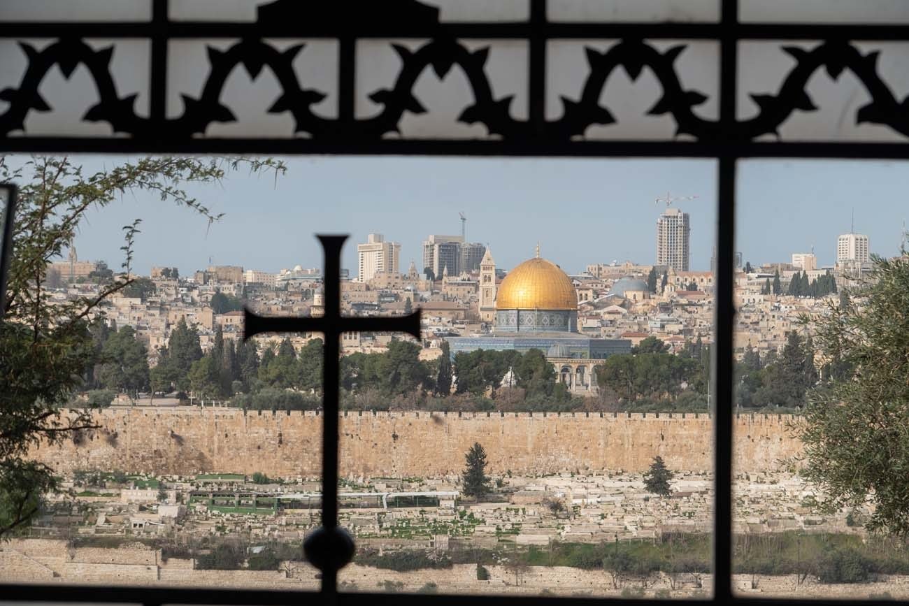 The gold-covered Dome of the Rock on the Temple Mount in Jerusalem’s Old City is seen through a window at the Dominus Flevit Church on the Mount of Olives in late January. (Photo by James Ramos/Herald)