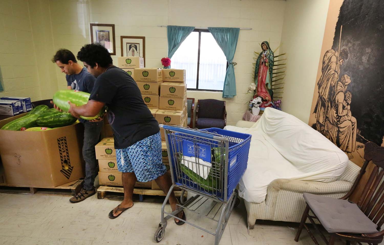 Men store watermelons at Casa Juan Diego House of Hospitality in Houston. The Catholic-run center, alongside Catholic Charities, supports refugees and immigrants. (Herald file photo)