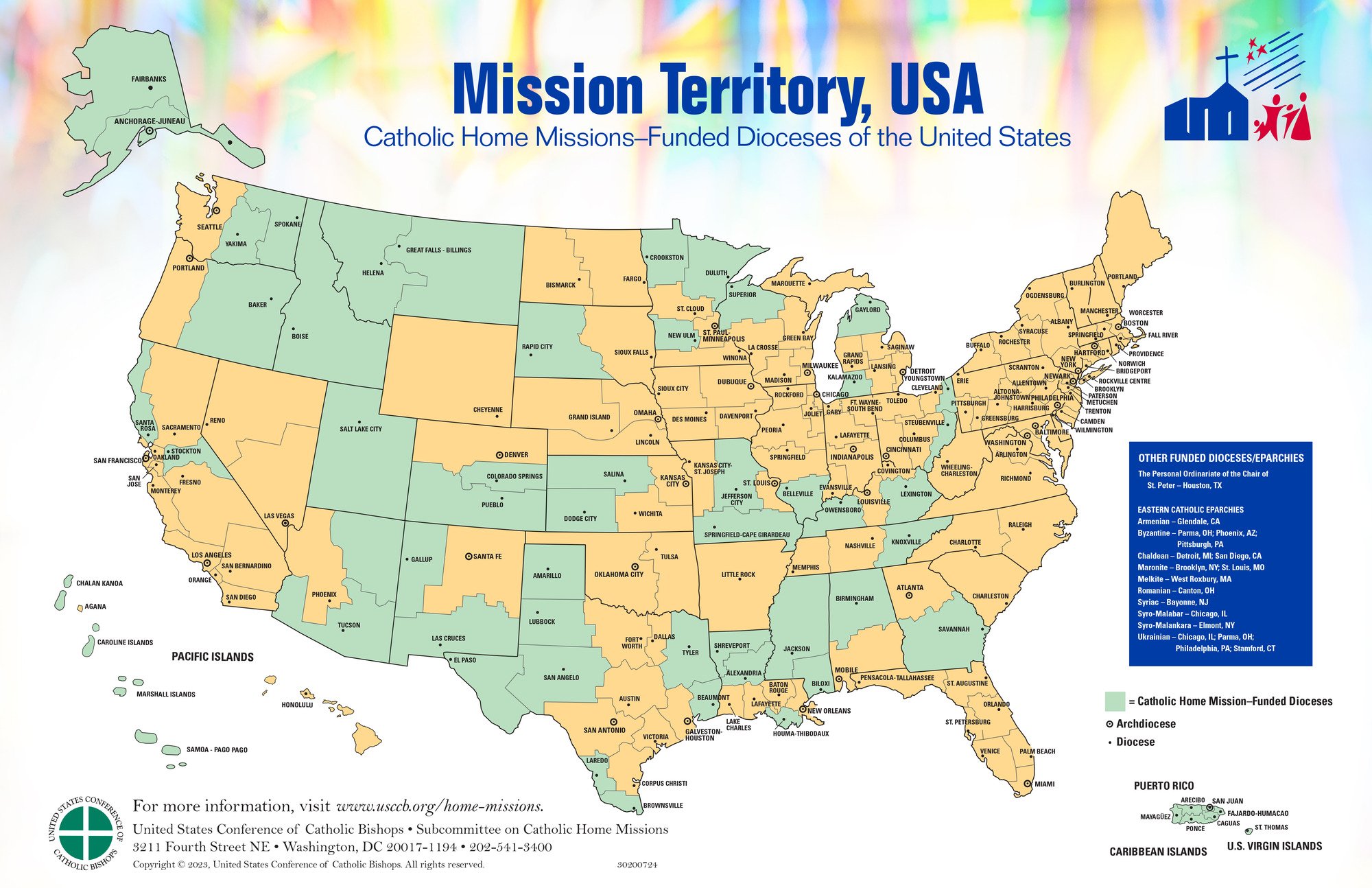 Catholic Home Missions supports dioceses throughout the United States and its territories that cannot support necessary pastoral ministries without outside financial assistance. Home mission dioceses often have small, widely dispersed Catholic populations, and many deal with economic challenges resulting from unemployment, migration, and natural disasters. Diocesan offices in home mission dioceses often have small staffs, but they are filled with passionate and dedicated clergy, consecrated religious sisters and brothers, and lay employees—all of whom work to be faithful, innovative leaders in the face of financial hardship and other challenges.