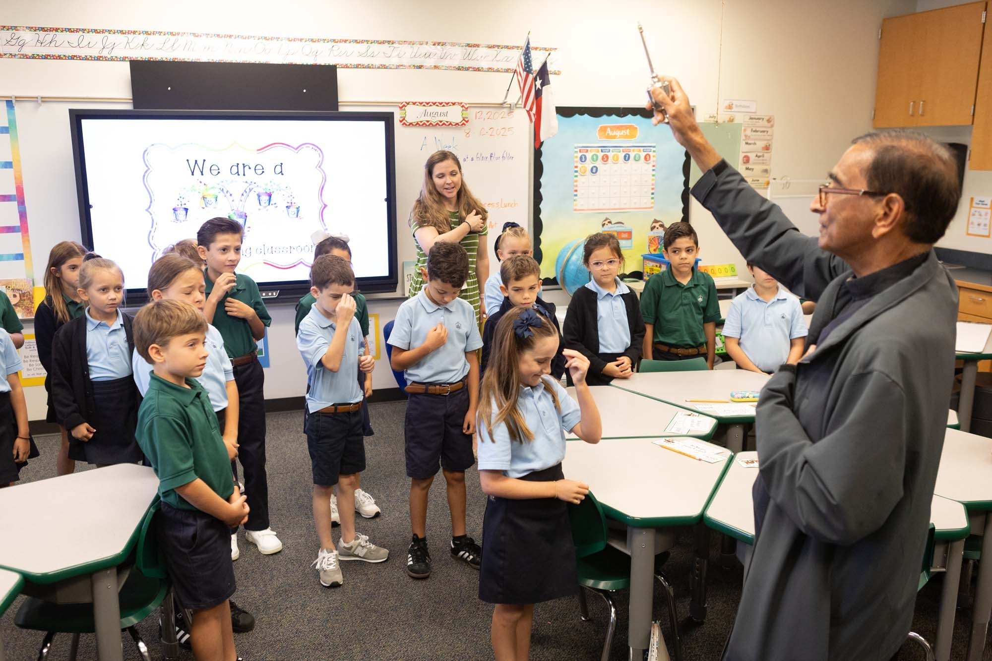 Father Mathew Thottiyil, parochial vicar of St. Anthony of Padua Parish and School in The Woodlands, blesses a group of St. Anthony of Padua School students on Aug. 12, the first full day of school. Below, a young student colors an activity page as the school’s nearly 500 students join thousands around the Archdiocese in beginning the new school year. (Photos by James Ramos/Herald)