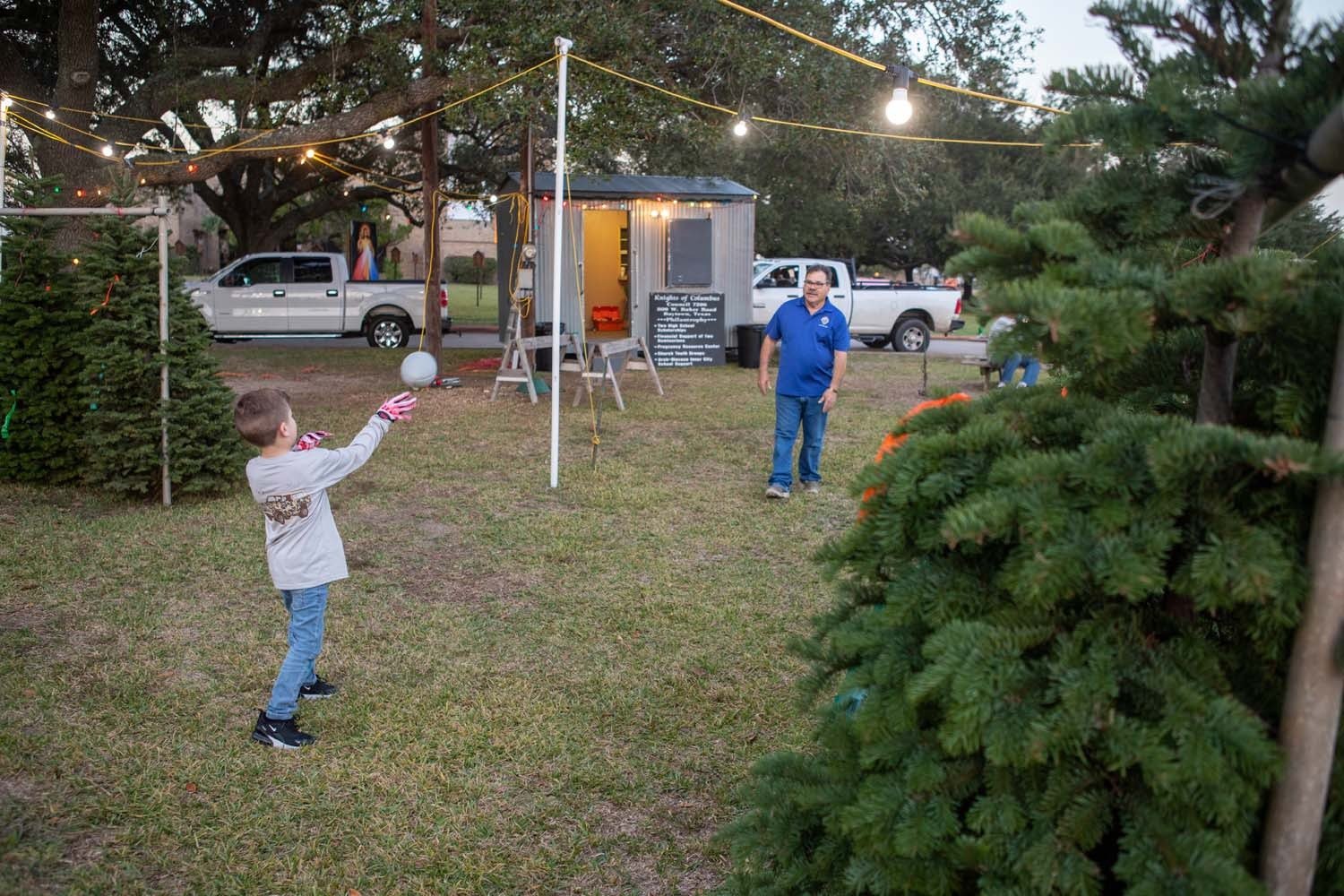 Eusebio Tijerina, at right, throws a football with his young relative, Hayes Derr, between trees in the Knights of Columbus Council 7206 Christmas Tree Lot at St. John the Evangelist Catholic Church in Baytown. (Photo by James Ramos/Herald)