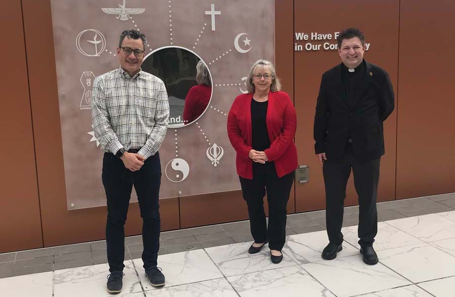 Rev. Greg Han welcomes Jan Skrehot, vice chair of Ecumenical and Interreligious Affairs Commission, and Father Orrin Halepeska to The Brigitte and Bashar Kalai Plaza of Respect at Interfaith Ministries for Greater Houston in December 2021. (Photo courtesy of the Office of Ecumenical and Interreligious Affairs)