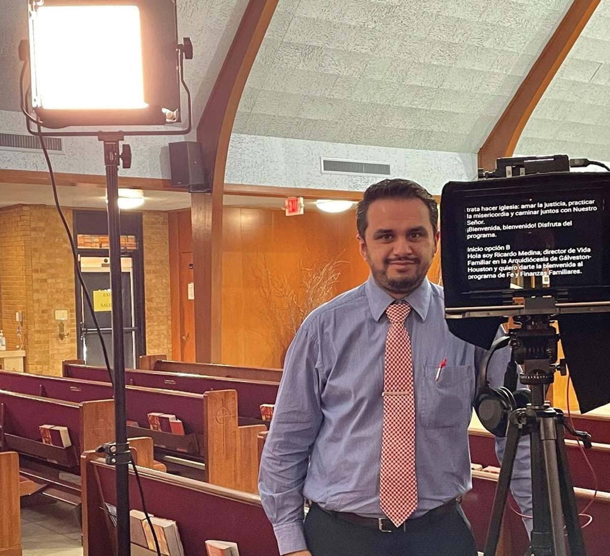 Teleprompter setup by Hector Perez, production coordinator, during the Family Life Ministry’s production of “Fe y Finanzas Familiares.” (Photo by Ricardo Medina)HOUSTON — As the Catholic Church continues to celebrate the “Year of St. Joseph” proclaimed by Pope Francis in Dec. 2020, this beloved patron saint of the universal Church and protector of families is a reminder of the faithful’s call to diligently nurture and provide for the needs of the family of God.