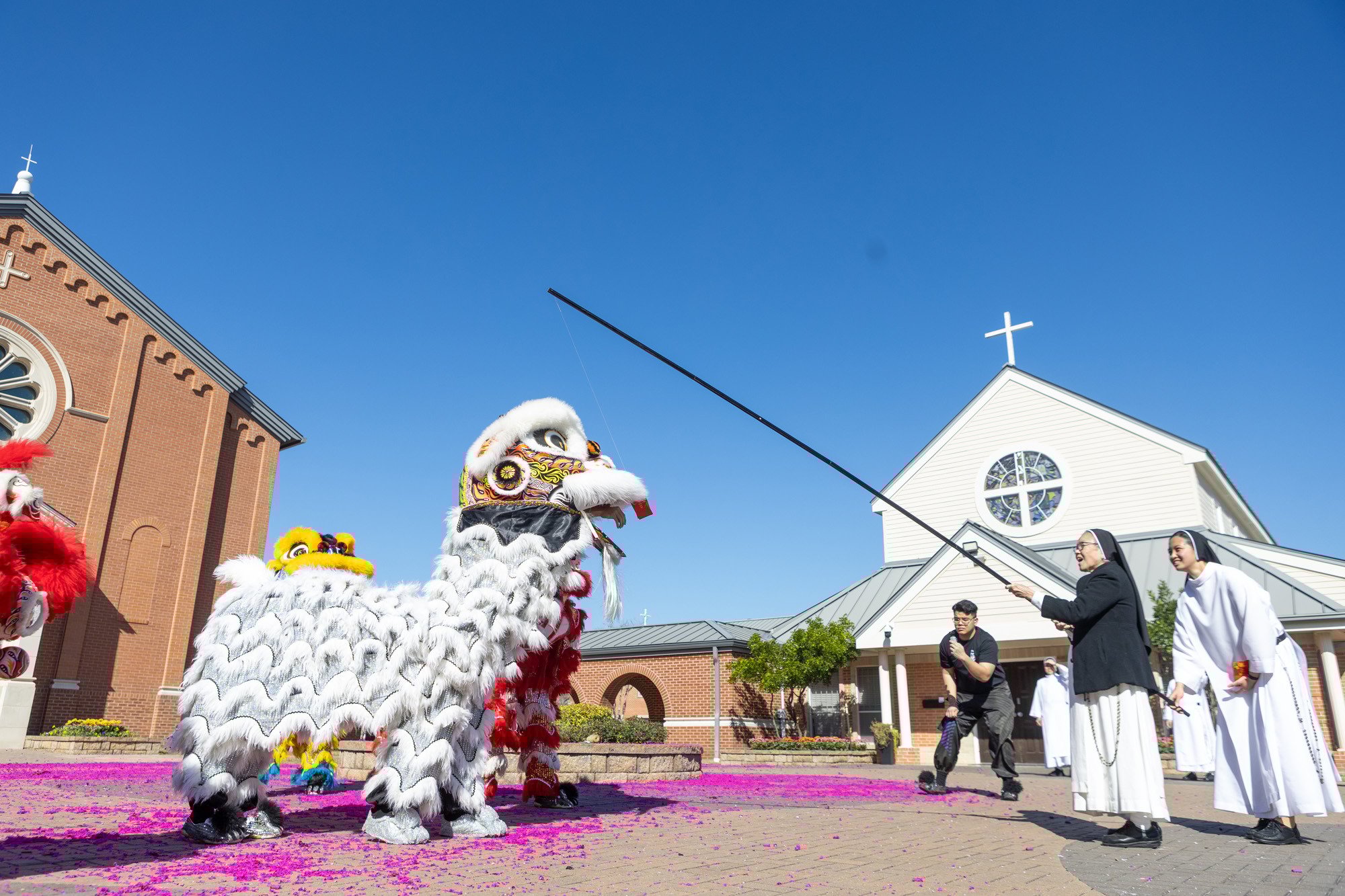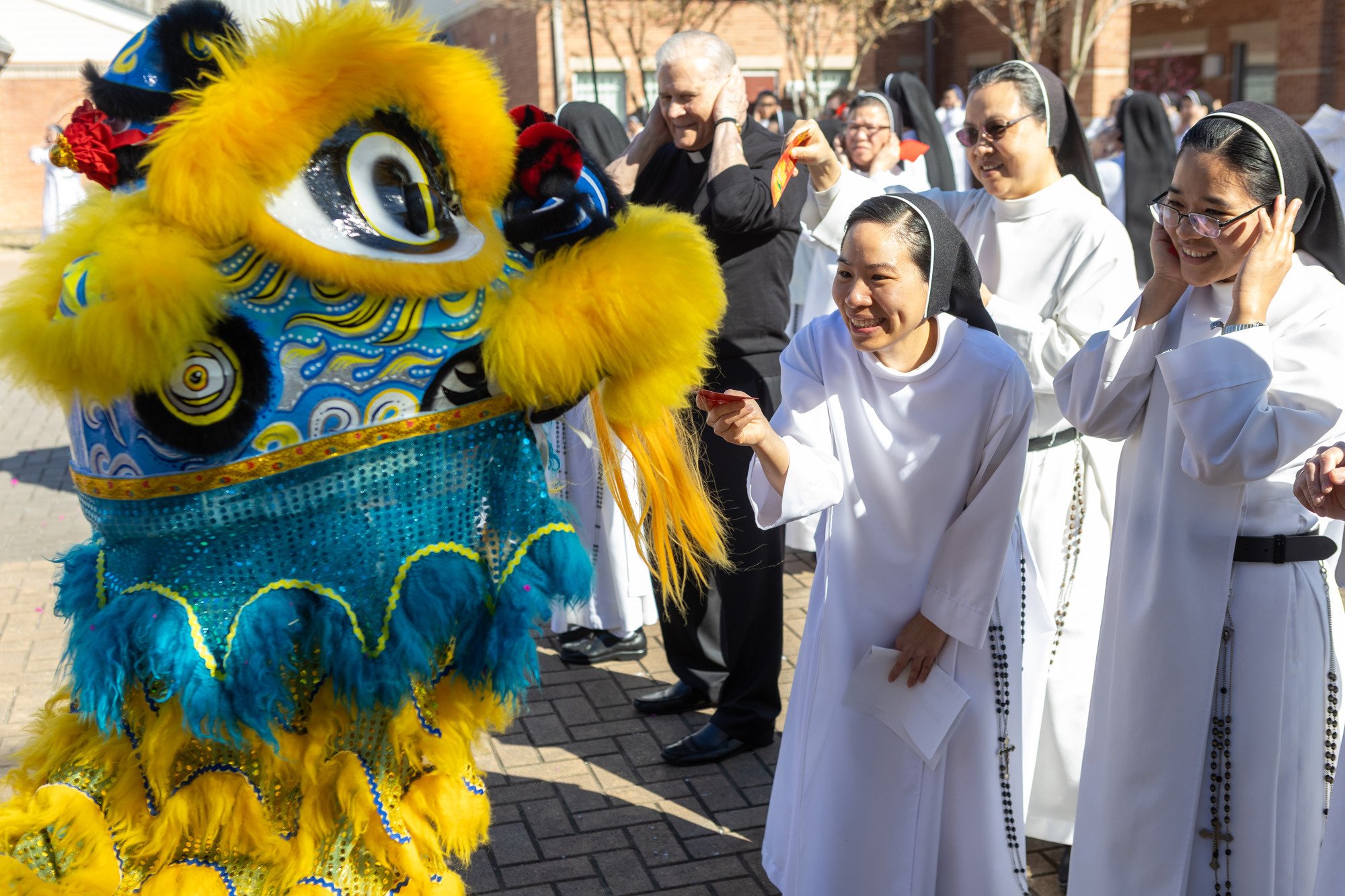 Members Dominican congregation greet a colorful lion with red envelopes during a Lunar New Year celebration at their convent.For Sister Maria Theresa Kim-Hong Nguyen, O.P., prioress provincial for the Dominican congregation, the gathering offered something rare and deeply needed: joyful rest.