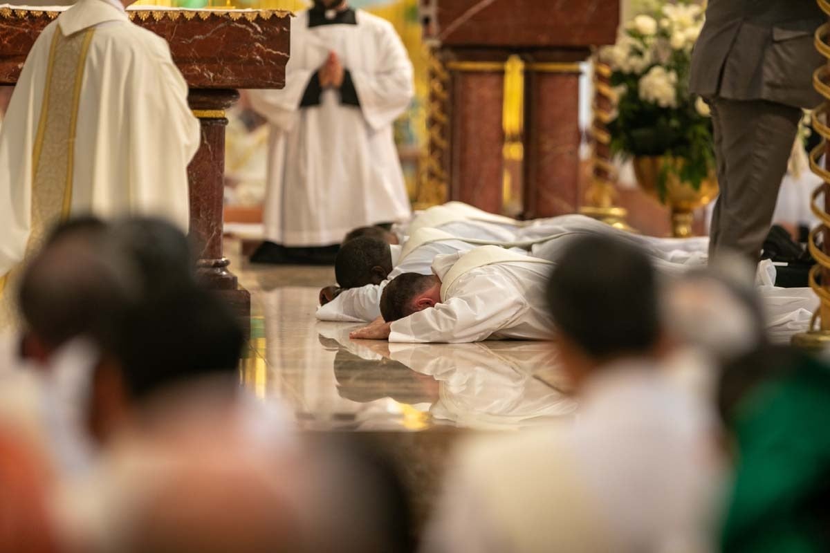 The Mass had the Rite of Ordination, which includes the Calling and Presentation of the Candidates, Election by the bishop and consent of the people, the promise of obedience and an invitation to prayer. During this invitation to prayer, the candidates prostrate themselves on the floor as the congregation invokes the prayers of the saints through a chanted litany and of the Holy Spirit.
