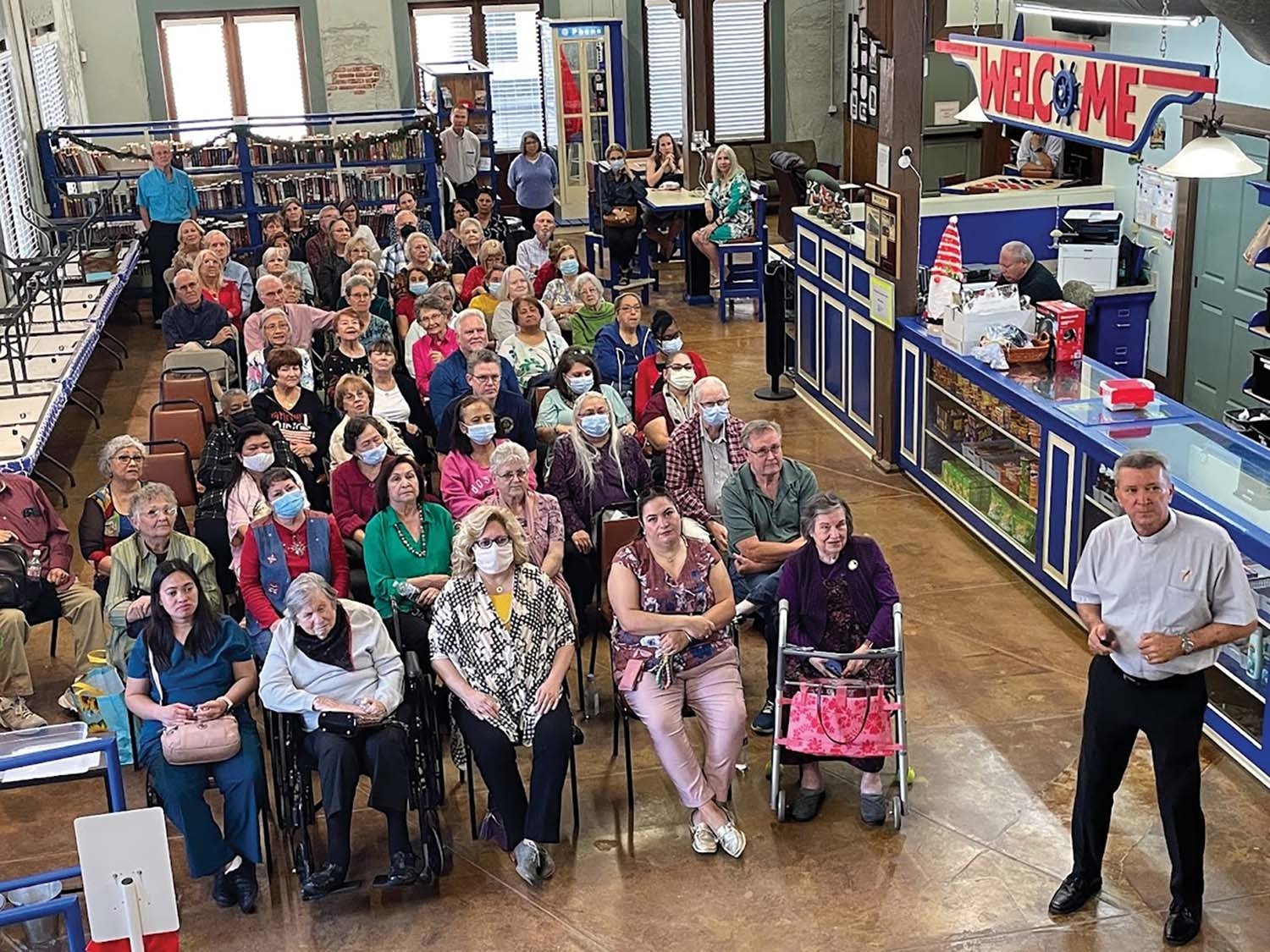 Port of Galveston Seafarers Center supporters, including the Bay Area Deanery Council of Catholic Women and Port Chaplain Deacon Jeffrey Willard, standing in front, at a Dec. 7 tour and luncheon listen to Bishop Brendan Cahill of the Victoria Diocese. Bishop Cahill, who also serves as Bishop Promoter for the Apostleship of the Sea in the U.S., thanked those gathered for their gifts to seafarers. (Photo courtesy of Beverly Brumbaugh)