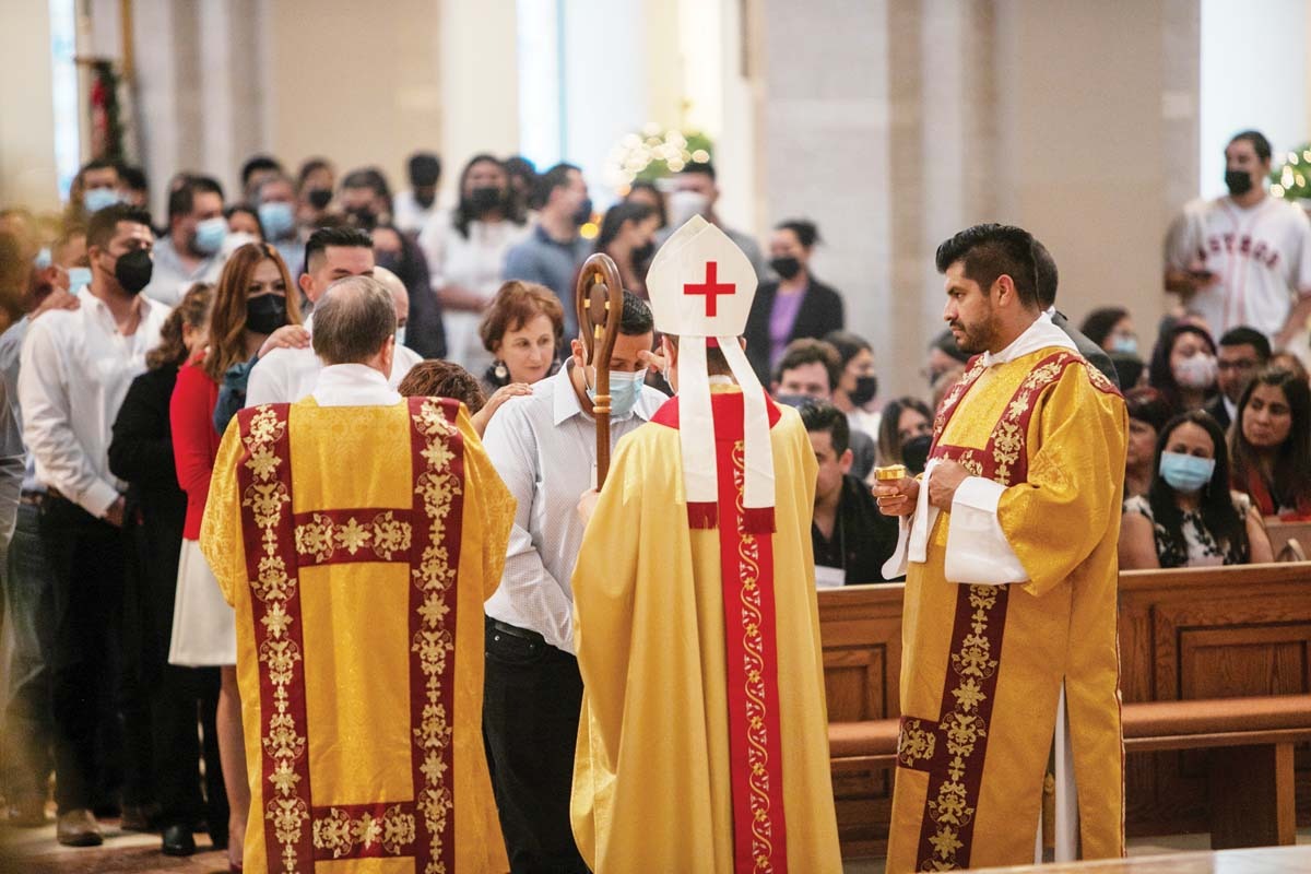 KINGWOOD — “Be sealed with the Gift of the Holy Spirit,” Daniel Cardinal DiNardo said, leaning forward to greet a bespectacled man in a green long sleeve while anointing him with chrism on his forehead.