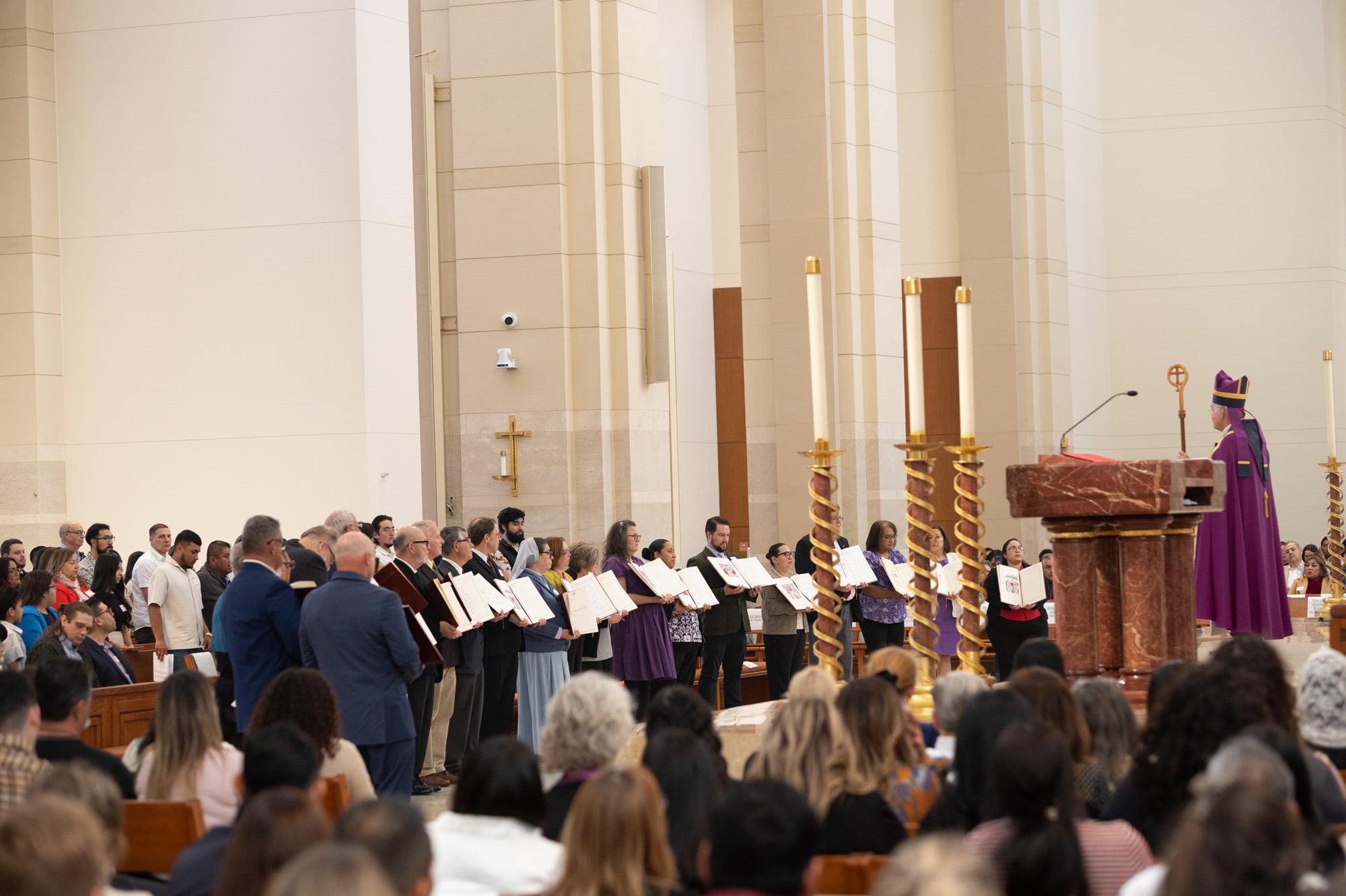 Candidates, or people who are already baptized Christians, take part in the Call to Continuing Conversion within the same Liturgy. At the presider’s invitation, they stand with their sponsors as the bishop recognizes their readiness to complete initiation and be received into full communion at Easter, normally through Confirmation and Eucharist. Unlike catechumens, candidates are not enrolled in the Book of the Elect because they are already baptized.