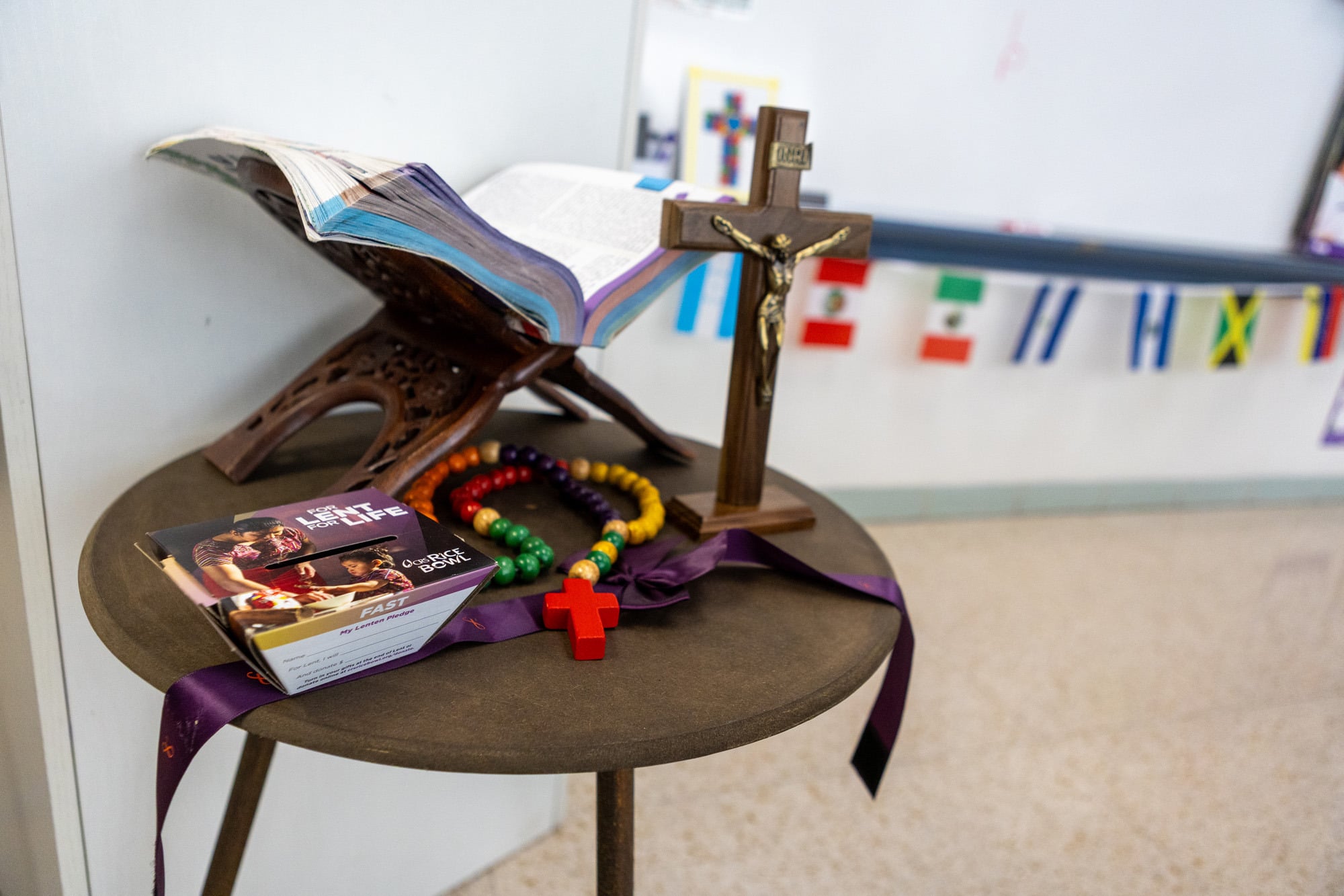 A Catholic Relief Services Rice Bowl is seen on a prayer desk next to a crucifix, Rosary and a Bible in a classroom at St. Jerome Catholic School in Houston. Lent kicks off the annual Rice Bowl effort that supports Catholic Relief Service projects around the world and in Galveston-Houston. (Photo by James Ramos/Herald)