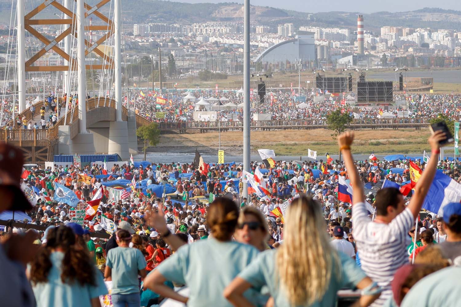 The crowd waits for Pope Francis' arrival to lead the World Youth Day prayer vigil with young people at Tejo Park in Lisbon, Portugal, Aug. 5, 2023. (CNS photo/Lola Gomez)