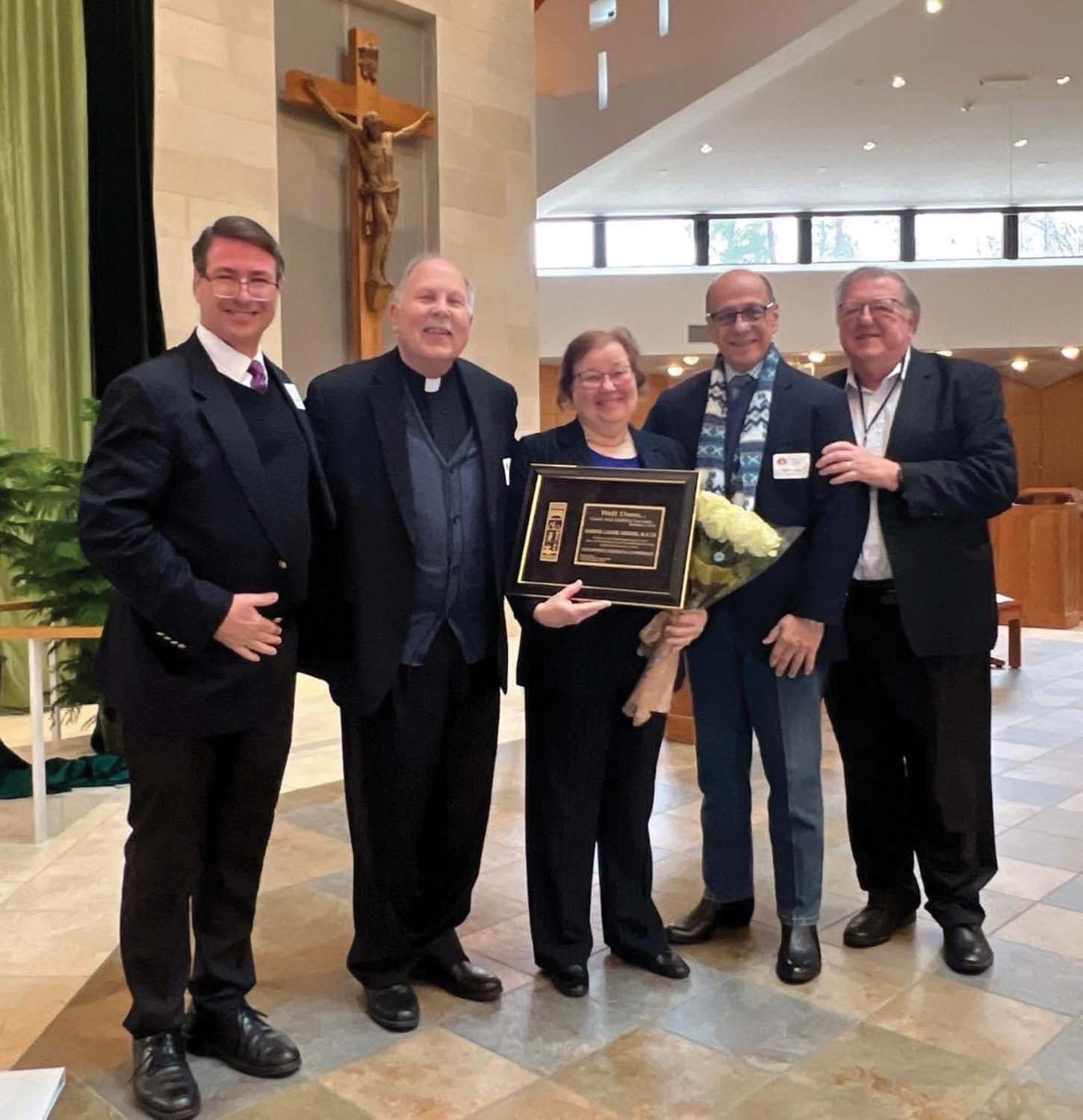 Sandy Higgins, center, received the Faithful Servant Award at St. Ignatius of Loyola Catholic Church in Spring. Pictured with her from left are: Dr. Dan Giradot, Father Leon Strider, Dr. Rick Lopez and her husband, Deacon Mike Higgins. (Courtesy photo)HOUSTON — Each January at the Annual Study Week, the Southwest Liturgical Conference (SWLC) presents “Faithful Servant” awards to recognize outstanding contributions to the work of liturgical renewal in the region.