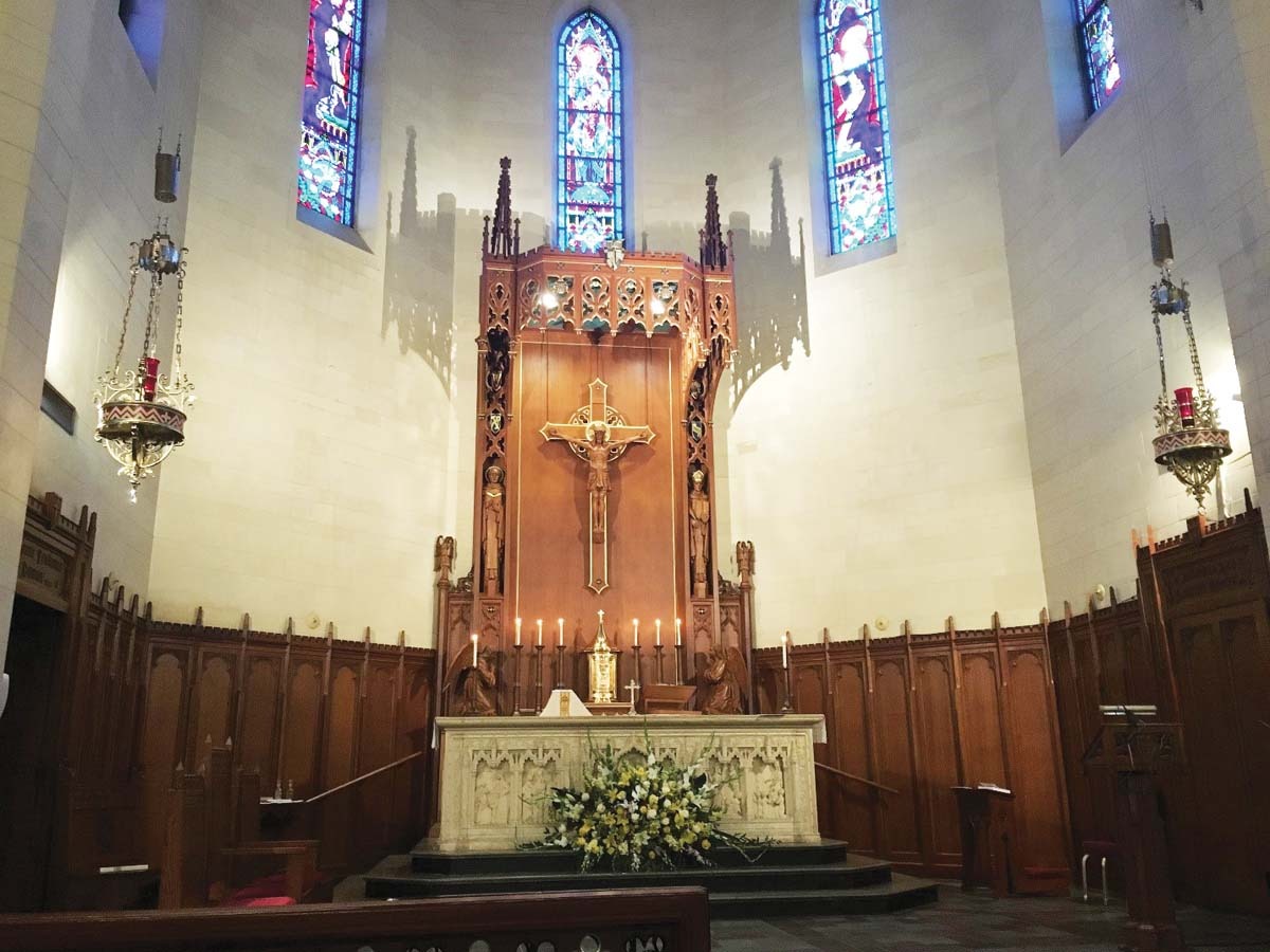 Five scenes are carved on the front: the Annunciation, Presentation, Nativity, Resurrection and Ascension. Each one is at eye level for meditation of the Incarnation when kneeling at the altar rail.