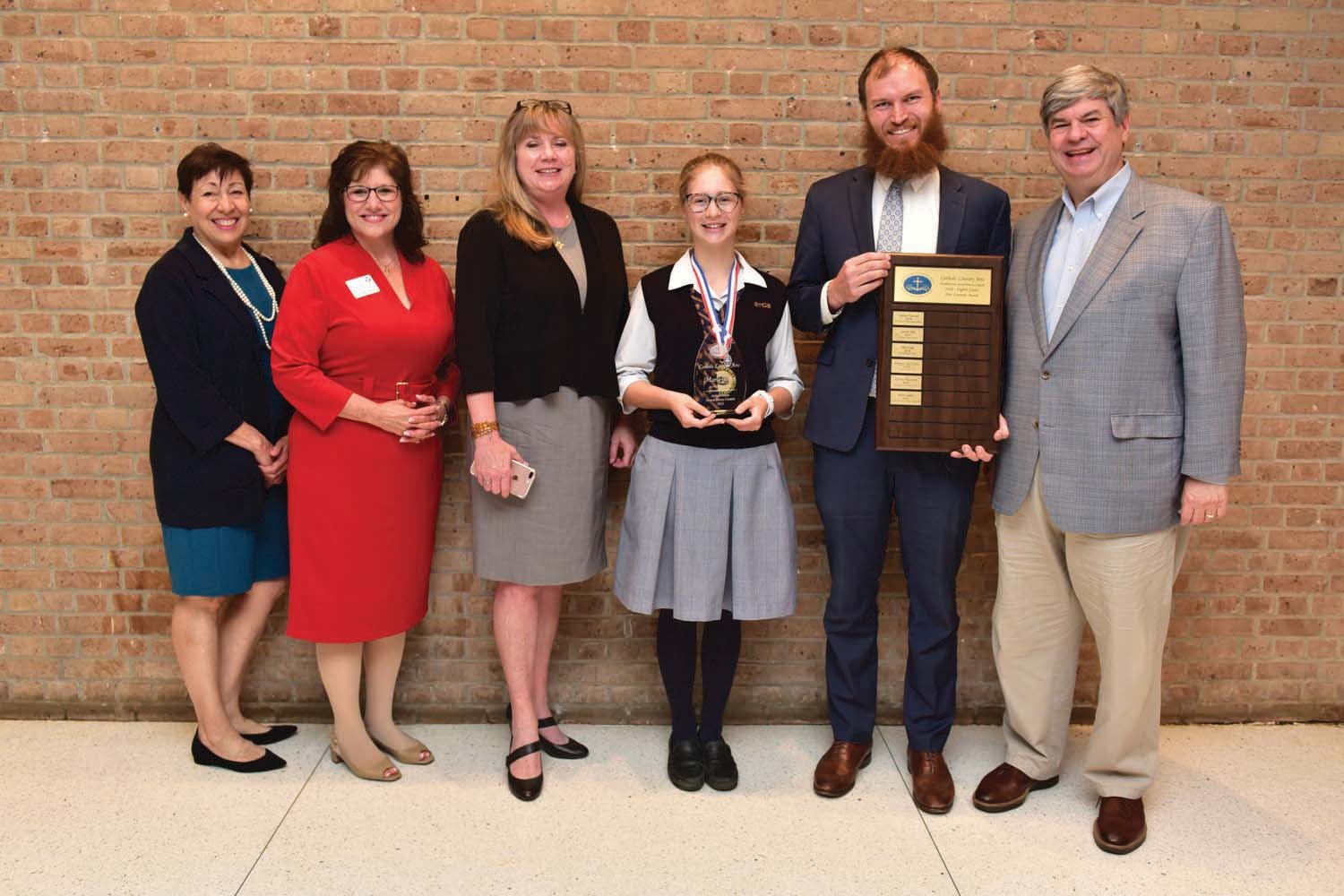 The Archdiocesan Middle School Poetry Contest reviewed more than 1,000 poems submitted and the winner is Maria Jesko, in center holding her award, of St. Theresa Catholic School in Sugar Land who wrote “Willing Forgiveness.” Congratulating her are, from left to right, Sarah Cortez, president of Catholic Literary Arts; Archdiocesan School Superintendent Debra Haney; St. Theresa Principal Francesca Rice; Jesko and her literature teacher Samuel Klumpenhouwer; and Scanlan Foundation President Larry Massey. (Photo by Thomas Hopkins)HOUSTON — By writing inspiring poems on deep topics like visiting a patient suffering terminal illness or describing Christ on the cross, 16 Catholic school students won a recent poetry contest focusing on spiritual works of mercy.