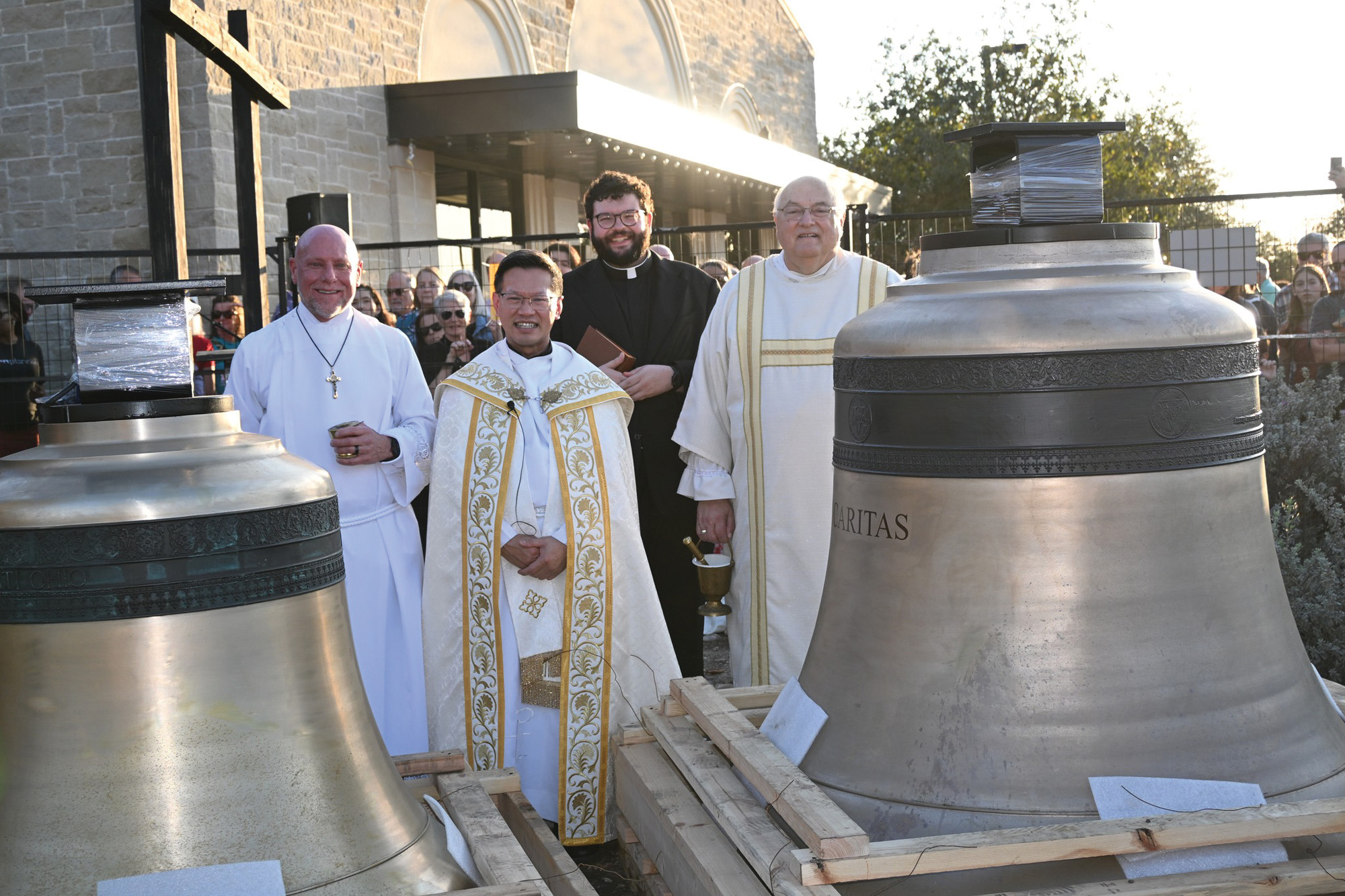 On Dec. 29, three new bells at St. Faustina Catholic Church were blessed by its pastor, Father Dat Hoang (second from left). Assisting him were (left to right) Acolyte Pitcher Allendorph, Father John Clark, parochial vicar at St. Faustina Catholic Church, and Deacon Randy Graham, director of Family Life at St. Faustina Catholic Church. Throughout history, bells have played an important role in the life of the Church. (hoto courtesy of St. Faustina Catholic Church)