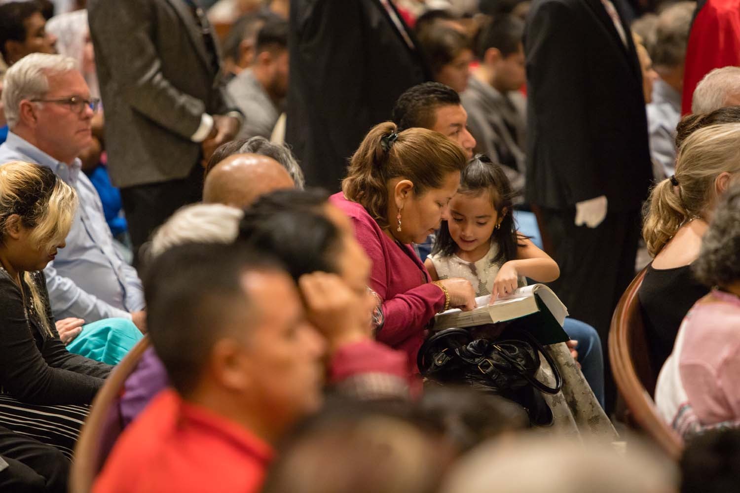 A woman and a young girl look through a hymnal during a recent Mass. (Photo by James Ramos/Herald)