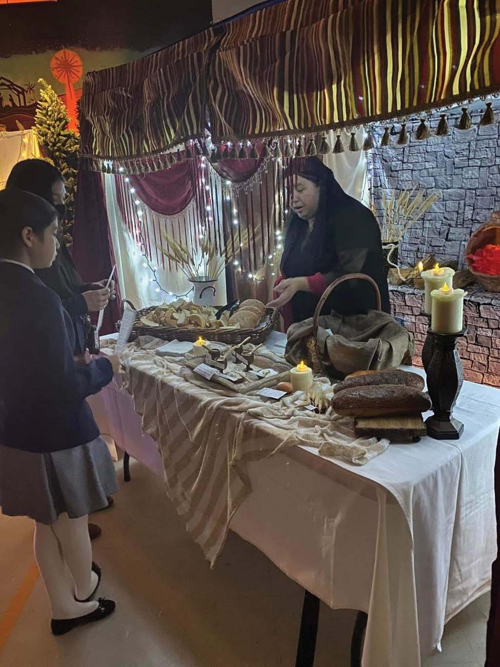 Above, the race finish is seen at a past Steps for Students event. Below, Our Lady of Fatima Catholic School in Galena Park hosted a “Walk Through Bethlehem” transforming their gym with tents, veils and decorations to share the message of Christmas and to raise funds for Steps for Students 5K Run/Walk. One of the tents shows Bethlehem, which means House of Bread, with an assortment of baked goods. (Photo courtesy of School Principal Miguel Sanchez)