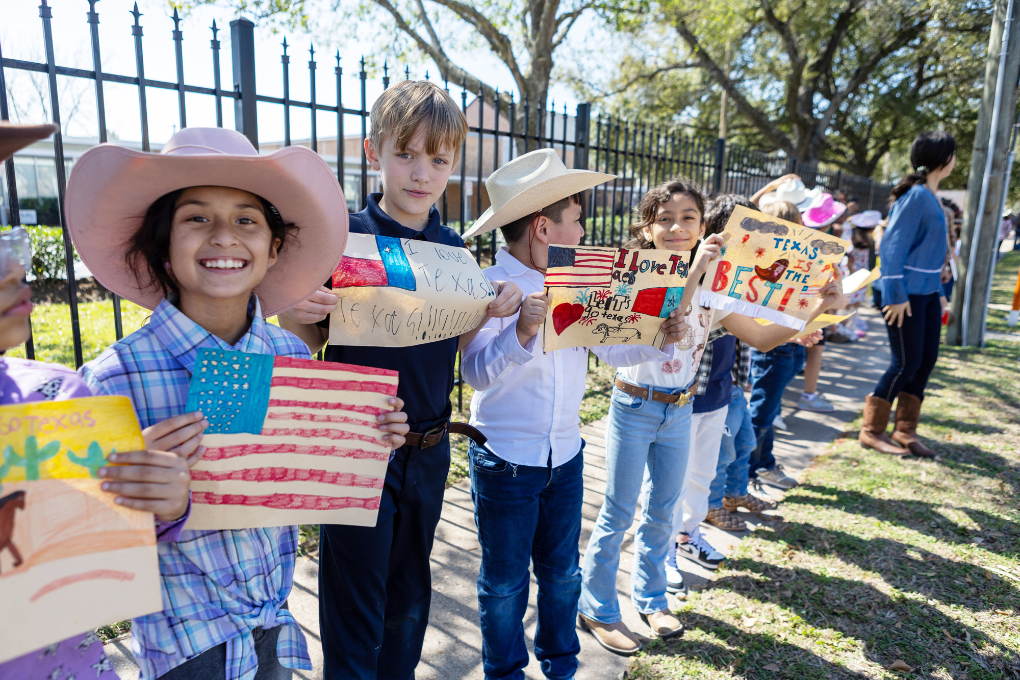 St. Jerome Catholic School students cheer as Salt Grass Trail Riders pass by the Spring Branch area school on Go Texan Day, Feb. 27, as part of the Houston Livestock Show and Rodeo. The arrival of the trail riders signals the start of Rodeo season in the Archdiocese. (Photos by James Ramos/Herald)SPRING BRANCH — On Feb. 27, Go Texan Day, the steady clop of hooves, the rumble of wagon wheels and the easy sway of riders on horseback signaled the arrival of rodeo season as trail riders made their annual trek into the Bayou City for the Houston Livestock Show and Rodeo.