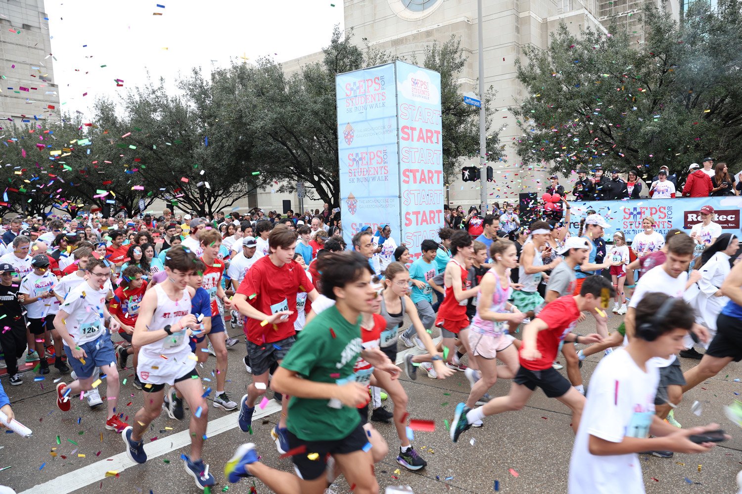 Runners charge through the Steps for Students 5K Walk/Run starting line at the Co-Cathedral of the Sacred Heart in downtown Houston on Feb. 10. Nearly 9,000 runners were registered for the event that raised more than $770,000 to benefit Catholic schools. (Photo by James Ramos/Herald)HOUSTON — Despite a damp start to the morning, thousands of runners and walkers gathered in downtown Houston on Saturday, Feb. 10, for the 19th Annual Steps for Students 5K Walk/Run to raise awareness and funds for Catholic schools in the Archdiocese.