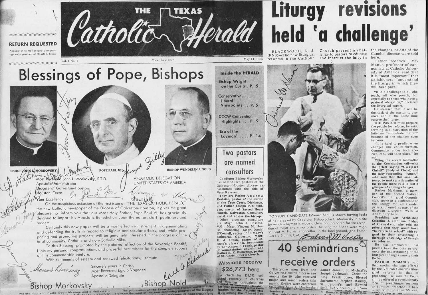 Recently a copy of the first issue of the Texas Catholic Herald visited the newsroom. Scattered across the front page, above the fold, were signatures of the founding staff of the Texas Catholic Herald, a snapshot of an important moment in time in the then-Diocese of Galveston-Houston. Each signature represented key efforts of Catholics committed to sharing the Good News to Texas and beyond.