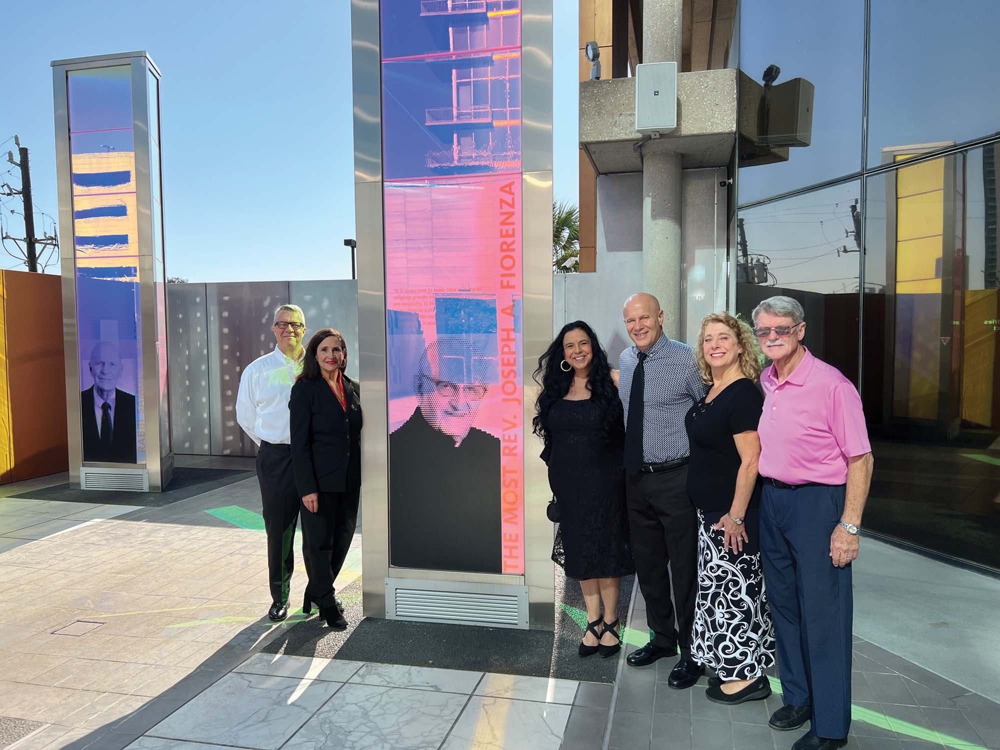 The family of Archbishop Emeritus Joseph A. Fiorenza visit the Brigette and Bashar Kalai Plaza of Respect at Interfaith Ministries for Greater Houston on the morning of Archbishop Fiorenza’s funeral Mass Sept. 29. Archbishop Fiorenza, Rev. William Lawson and the late Rabbi Samuel Karff, all known as The Three Amigos, are honored for their social justice and equality work embodied in the Pillars of Light sculptures. From left to right are Kelly and wife Mary Donaldson (Archbishop Fiorenza’s niece), Lisa and Mark Fiorenza (Archbishop Fiorenza’s nephew); Cassie Fiorenza Simpson (Archbishop Fiorenza’s niece) and her husband Mike Simpson. (Photo courtesy of Interfaith Ministries)