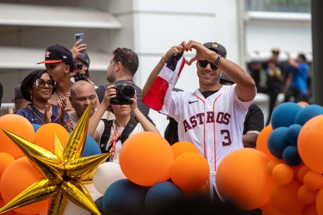 At right: Jeremy Peña #3 of the Houston Astros gestures during a World Series Parade on Nov. 7, 2022 in downtown Houston. The 25-year-old Astros shortstop was named MVP for the 2022 World Series and 2022 American League Championship Series, as well as a Gold Glove winner. (Photo by James Ramos/Herald)