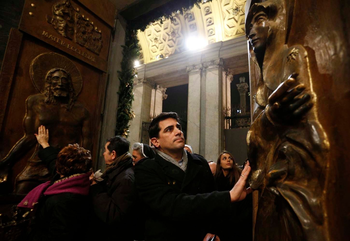 People pass through the Holy Door of the Basilica of St. Mary Major in Rome after its opening by Pope Francis for the Jubilee of Mercy in this file photo from Jan. 1, 2016. During jubilee years, Holy Doors are opened at the Basilica of St. Peter at the Vatican, and the Rome basilicas of St. Mary Major, St. John Lateran and St. Paul Outside the Walls. (CNS photo/Paul Haring)