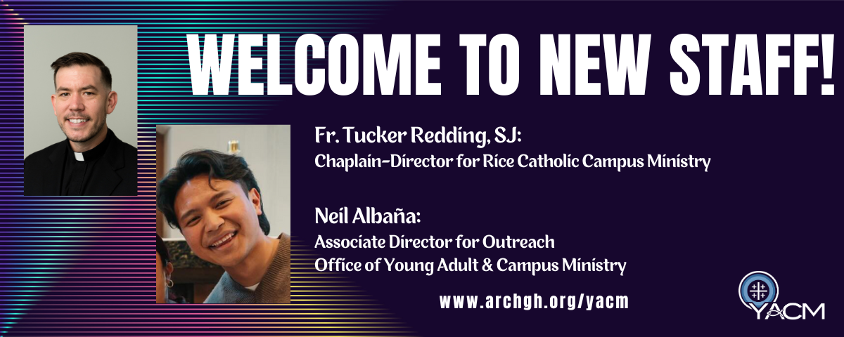 The Office of Young Adult & Campus Ministry is pleased to announce two new staff members joining us in July! Fr. Tucker Redding, SJ, will be starting as the new Chaplain-Director for the Rice Catholic Student Center. Neil Albaña will be starting as the new Associate Director for Outreach with the Office of Young Adult & Campus Ministry. Please join us is welcoming these two new members of the team and please keep them in your prayers as they begin their ministry.