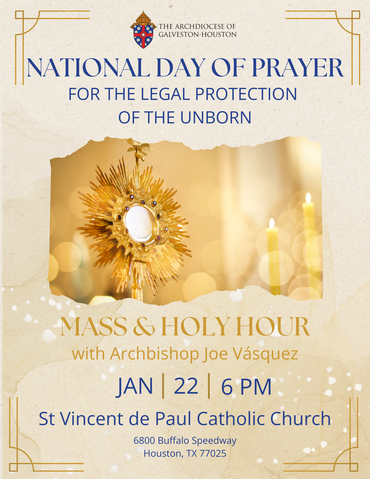 Únase a la Oficina de Actividades Pro-Vida el 22 de enero de 2026 a las 6 p.m. para una santa Misa seguida por una hora Santa con motivo del Día Nacional de Oración por la Protección Legal de los Niños Nonatos, con el arzobispo Joe S. Vásquez como celebrante principal.