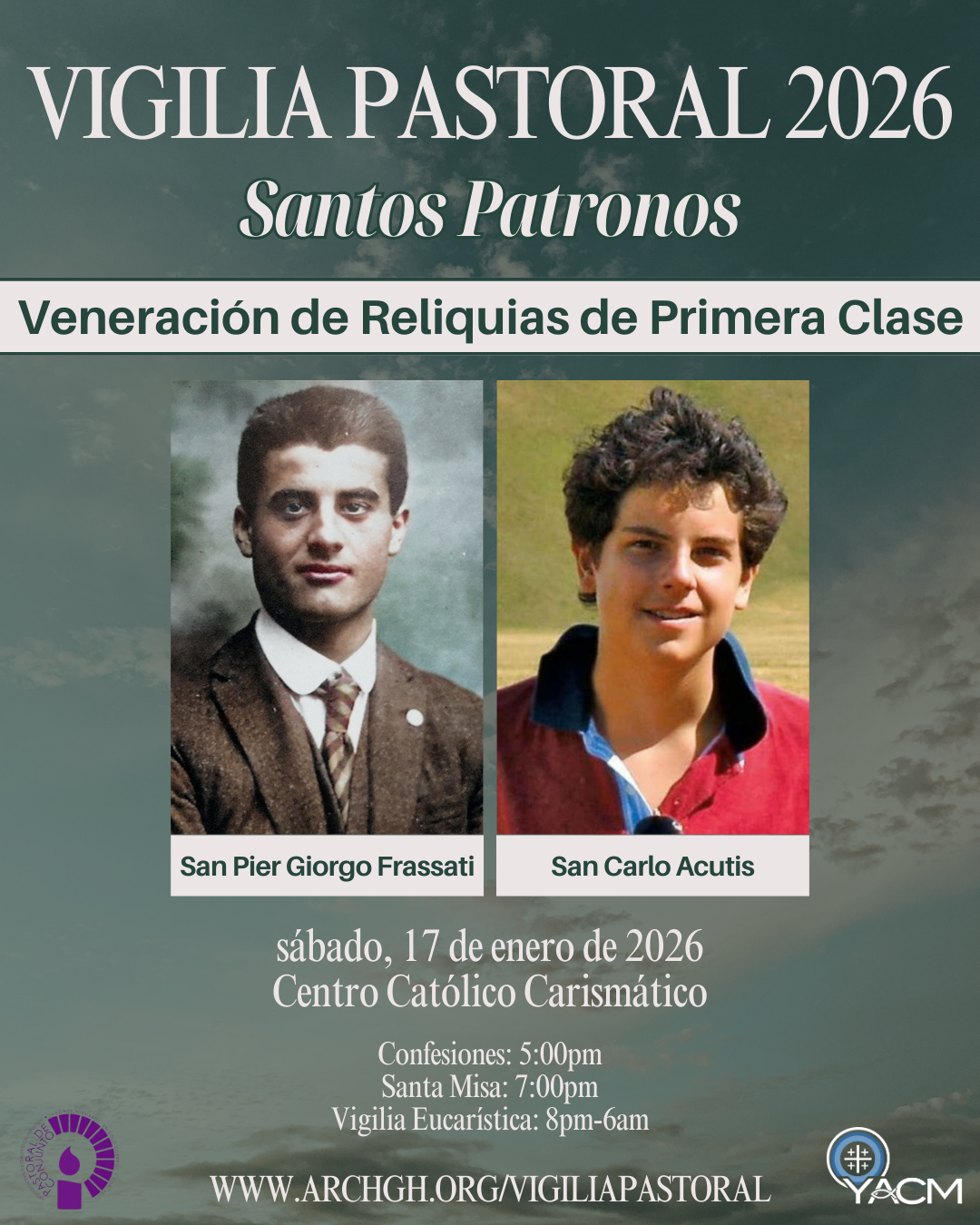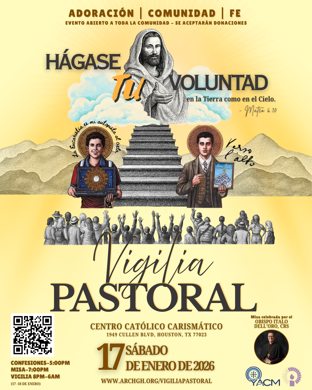 La Vigilia Pastoral 2026 se llevará a cabo el sábado, 17 de enero de 2026 de 5:00pm a 6:00am (18 de enero) en el Centro Católico Carismático (1949 Cullen Blvd., Houston, TX 77023). Acompáñenos en Adoración Eucarística junto con los jóvenes adultos de nuestra arquidiócesis. Este evento está abierto a toda la comunidad. ¡Ya está disponible la Camiseta de la Vigilia Pastoral 2026! Adquiere la tuya en preventa por $15 o $20 el día del evento. La fecha límite para la preventa es el 28 de diciembre.