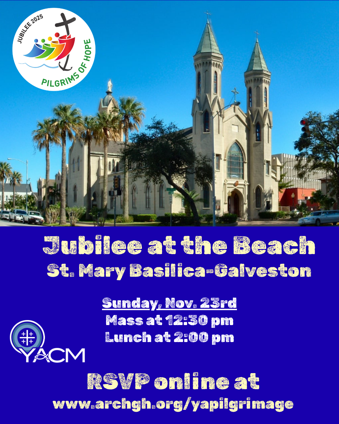 All young adults are invited to join us for a Jubilee pilgrimage as we close out the Jubilee Year of Hope. We’ll gather on Sunday, November 23, at St. Mary Cathedral Basilica in Galveston (an official Jubilee pilgrimage site) for their 12:30 pm Mass. After Mass, we’ll gather to pray a Jubilee prayer together then head to a local restaurant on the beach for lunch and fellowship. No cost to attend, but we ask that you RSVP by Nov. 20 so we can make a reservation. Lunch is on your own.